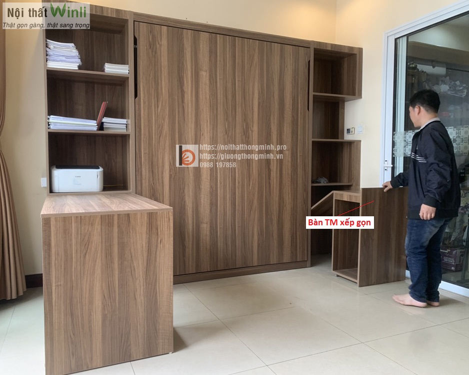 Phòng ngủ nhỏ có giường ngủ, bàn làm việc và tủ sách nhưng vẫn đảm bảo phòng nhỏ gọn gàng, rộng rãi thì không nên bỏ qua mẫu giường thông minh kết hợp bàn xếp và tủ sách trên đây của Nội Thất Winli nhé!